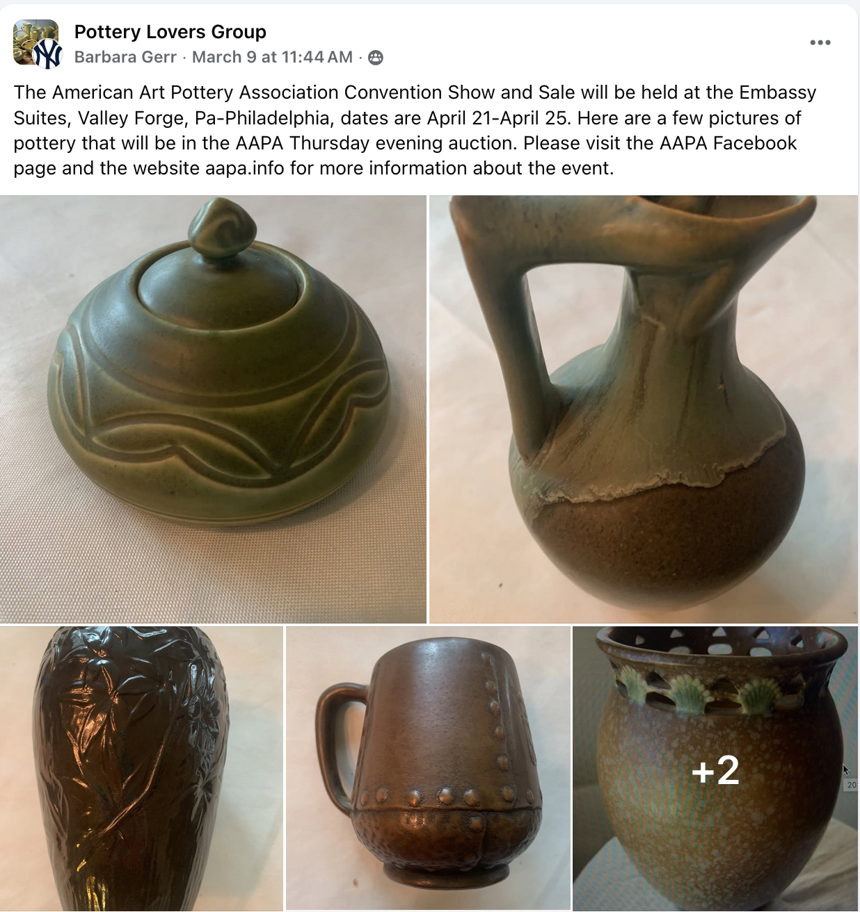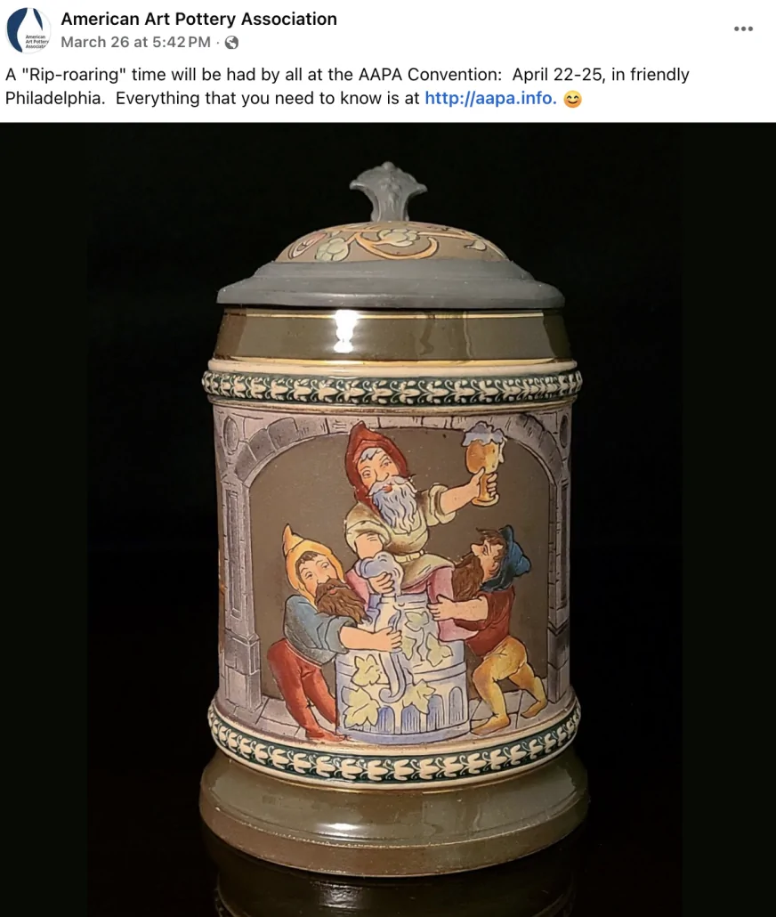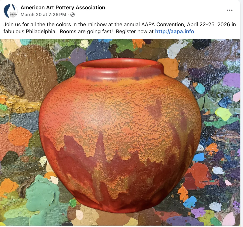 Philadelphia is the place to visit this year — and if you’re an enthusiast of American Art Pottery, you’ll be happy to hear this year’s annual American Art Pottery Association convention and art pottery sale will take place in “The City of Brotherly Love.”