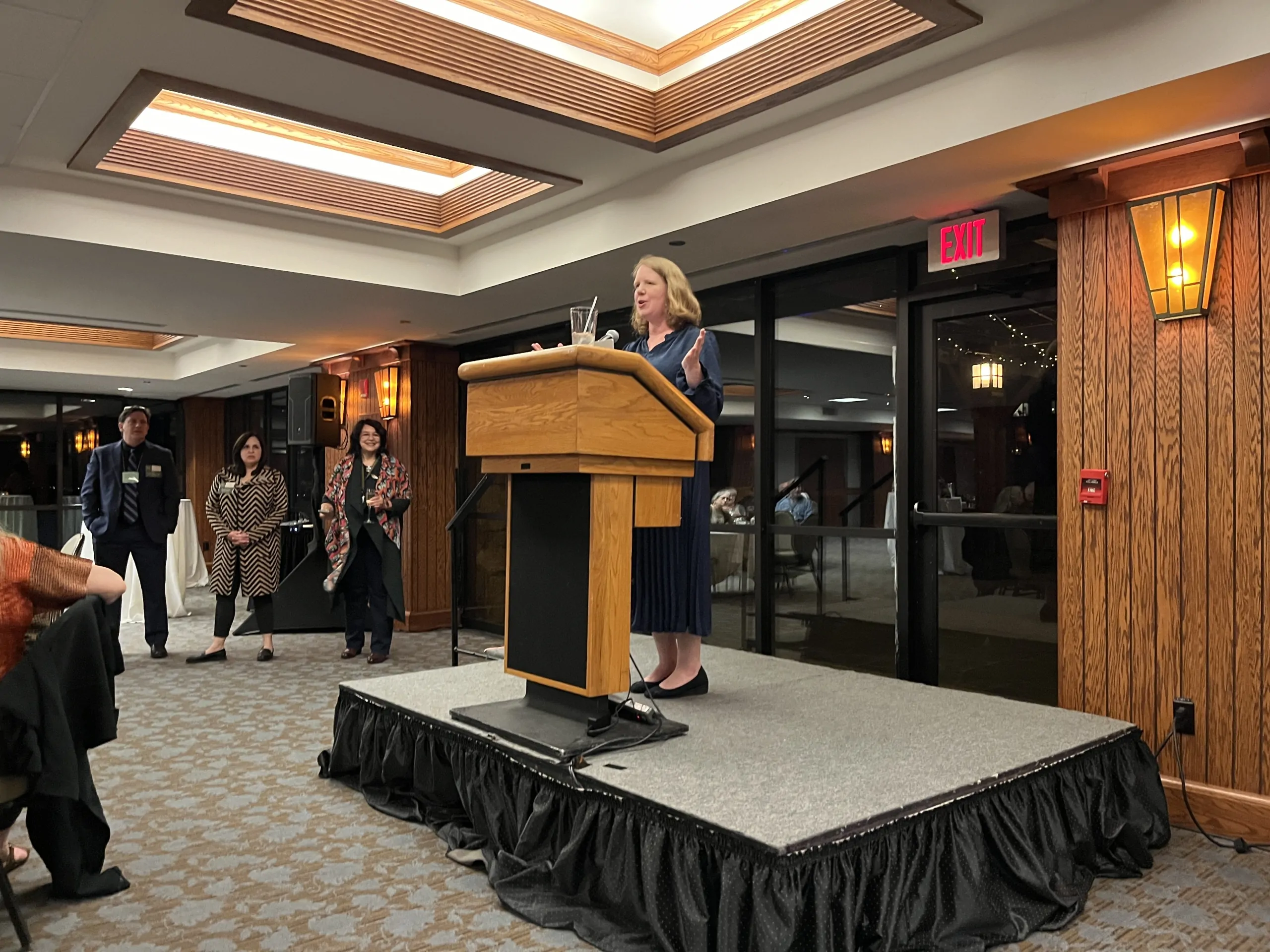 Conference Director Kate Nixon addresses the crowd at the 2024 Craftsman Reception alongside Barbara Weiskittel, Vonda Givens, and Jonathan Clancy, the leadership of the Stickley Museum at Craftsman Farms. Photo by Ray Stubblebine.